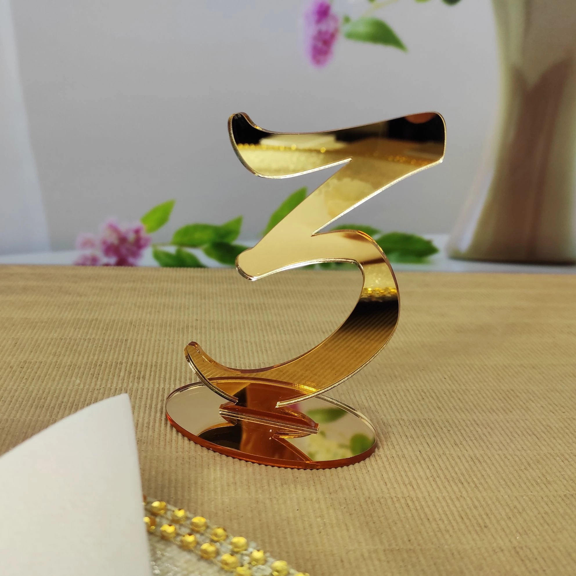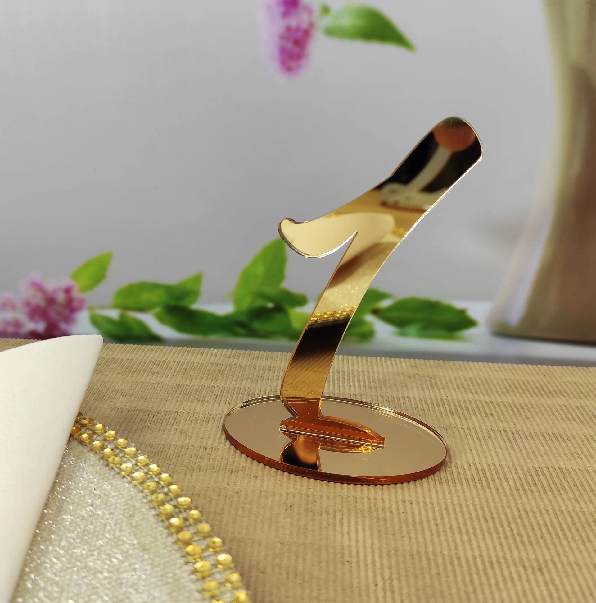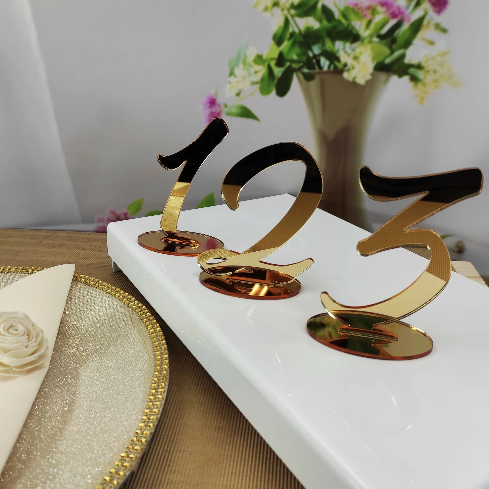 Označte svoje svadobné stoly pomocou našich čísel vyrezaných zo zlatého zrkadlového akrylu s využitím technológie laserového výrezu.