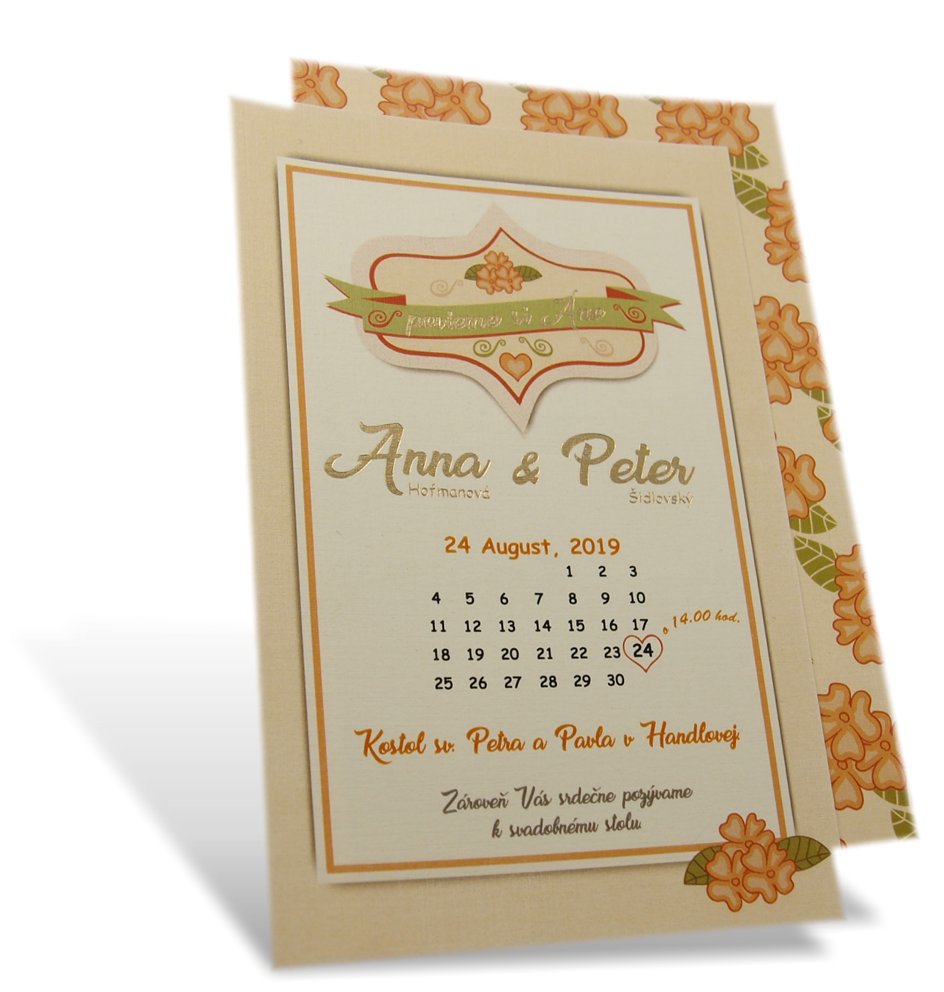 Obojstranné svadobné oznámenia z krémového jemne štruktúrovaného papiera. Predná strana je tlačená kombináciou digitálnej tlače a zlatej termoražby. Zadná strana je tlačená digitálnou tlačou.