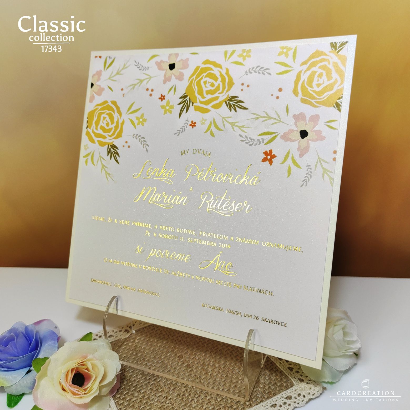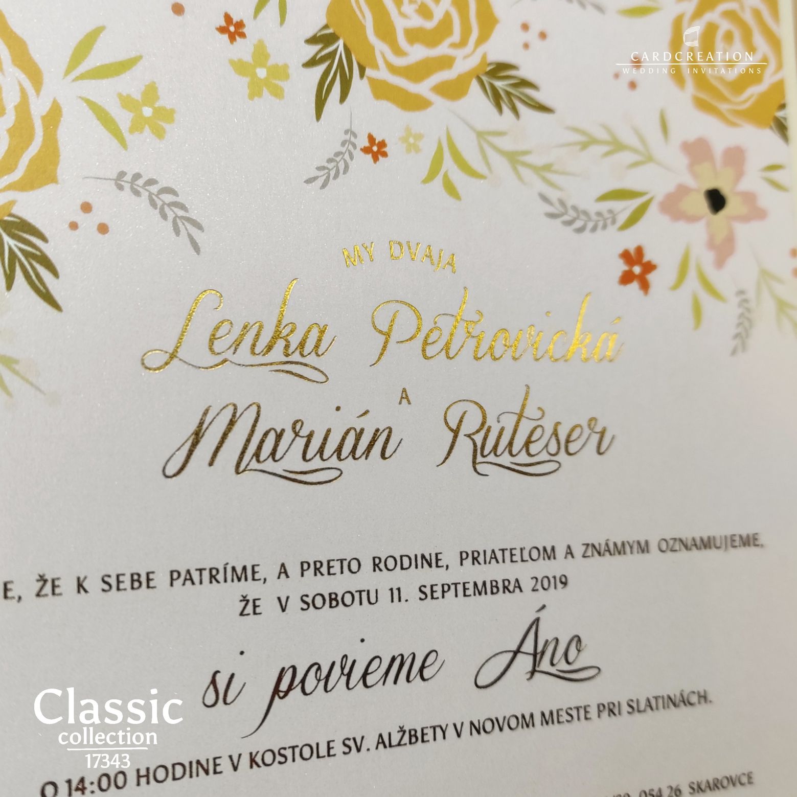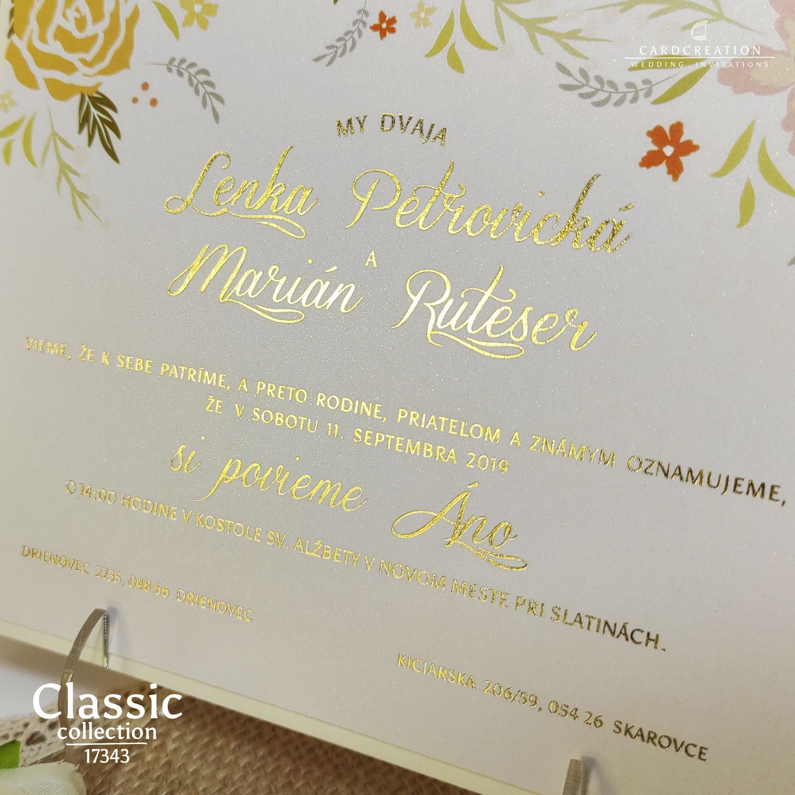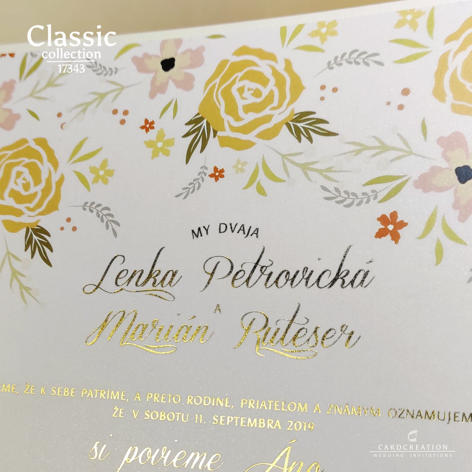 Moderné svadobné oznámenie. Plnofarebná kvetinová potlač na perleťovom bielom papieri. Tlač textov zlatou termoražbou. Luxusný nádych oznámeniu dodáva podlepenie krémovým metalickým papierom. K oznámeniu sa v tomto štýle vyrábajú aj ostatné tlačoviny na svadbu.