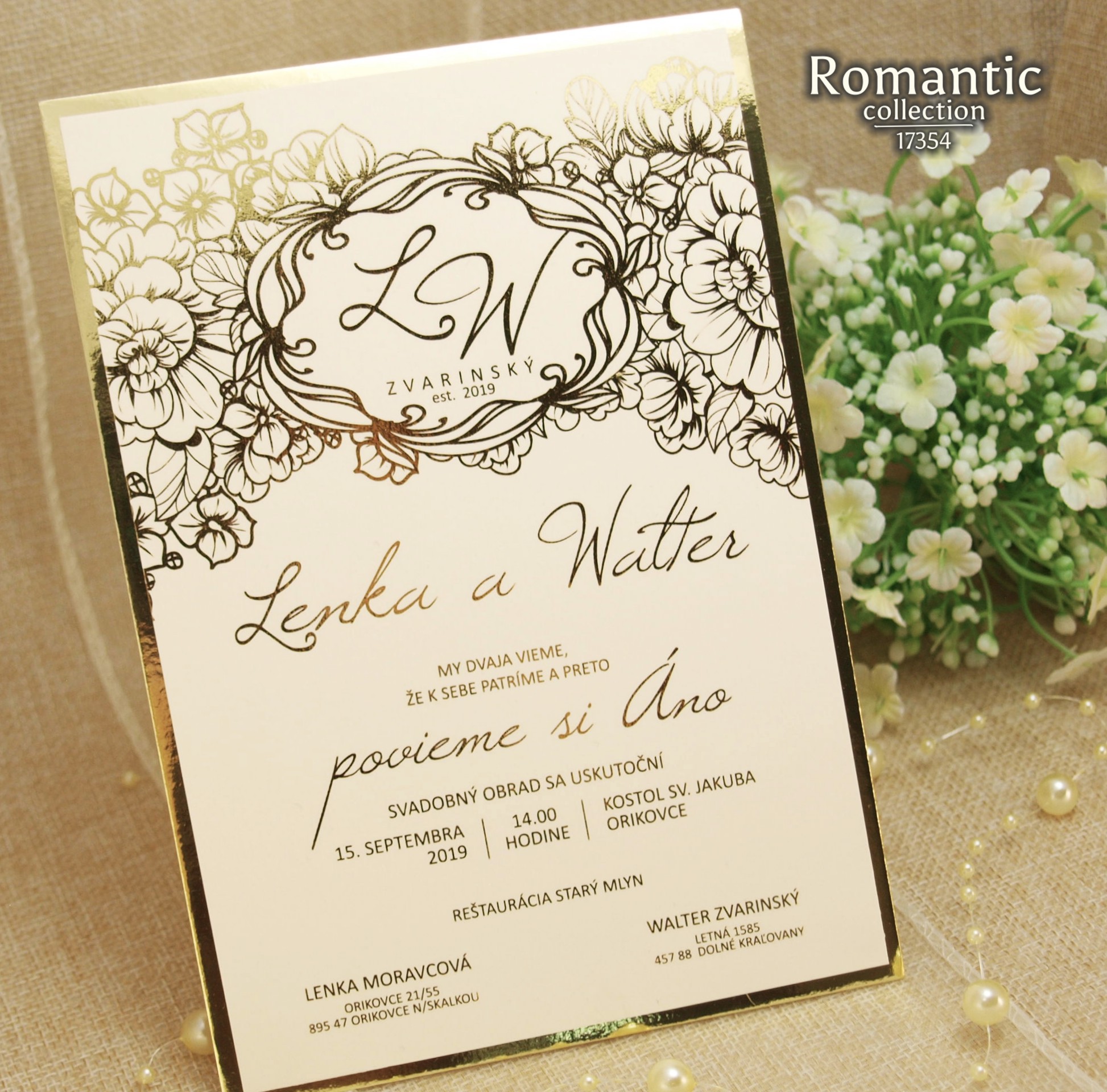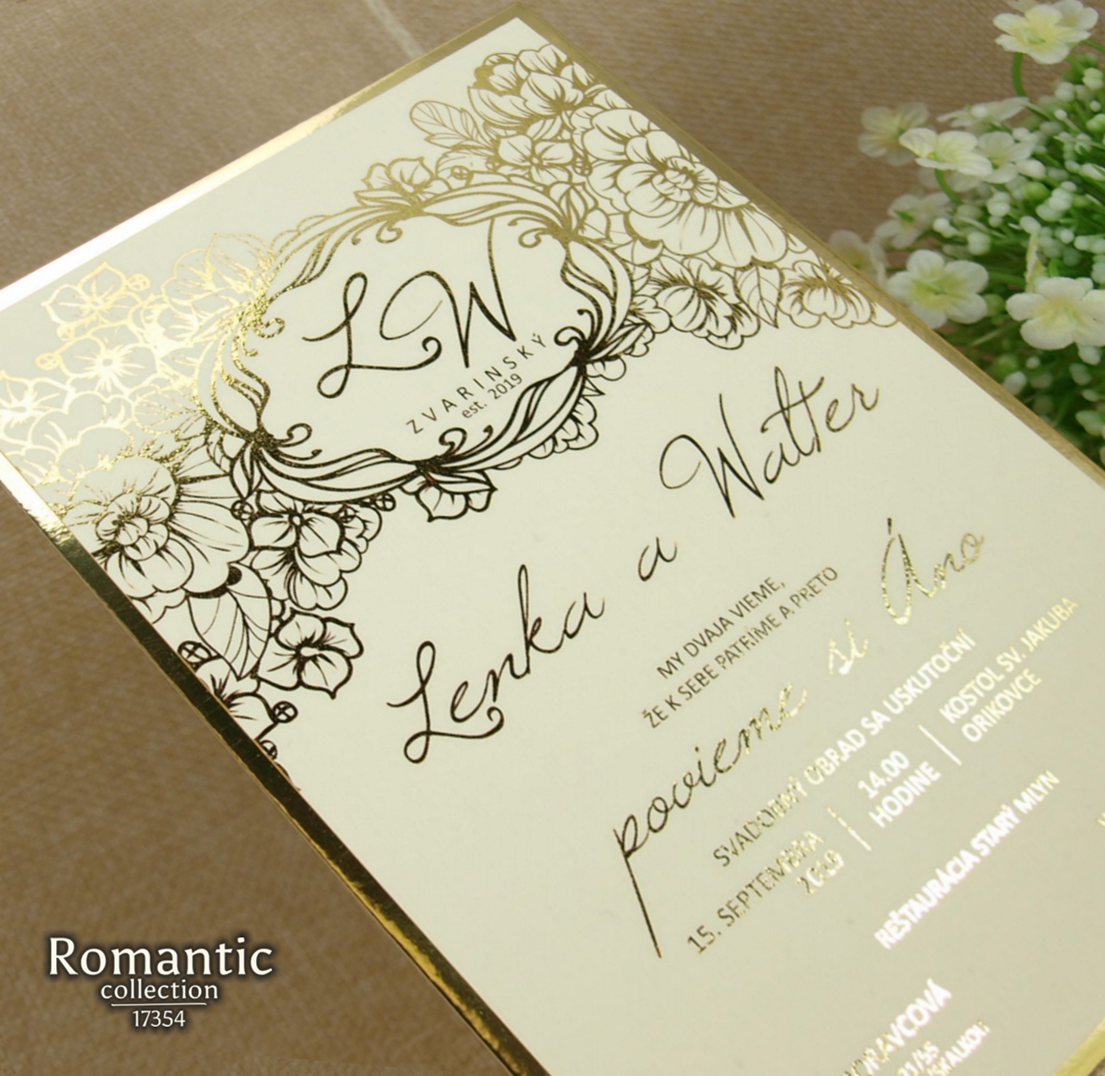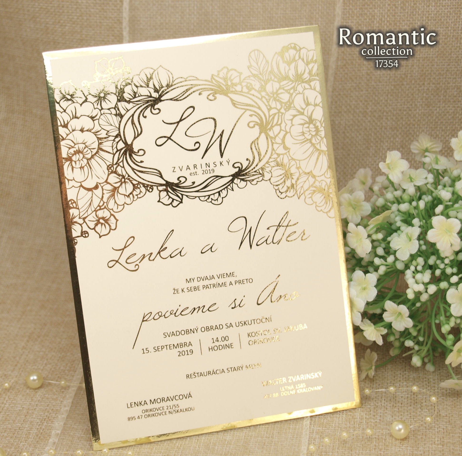 Moderné svadobné oznámenie tlačené zlatou fóliou na luxusnom krémovom kreatívnom papieri. Oznámenie sa skladá z dvoch zlepených kartičiek-spodný papier je zrkadlovo zlatý luxusný kartón. Rozmer oznámenia je 120x170mm. K oznámeniu sa v tomto štýle vyrábajú aj ostatné tlačoviny na svadbu.