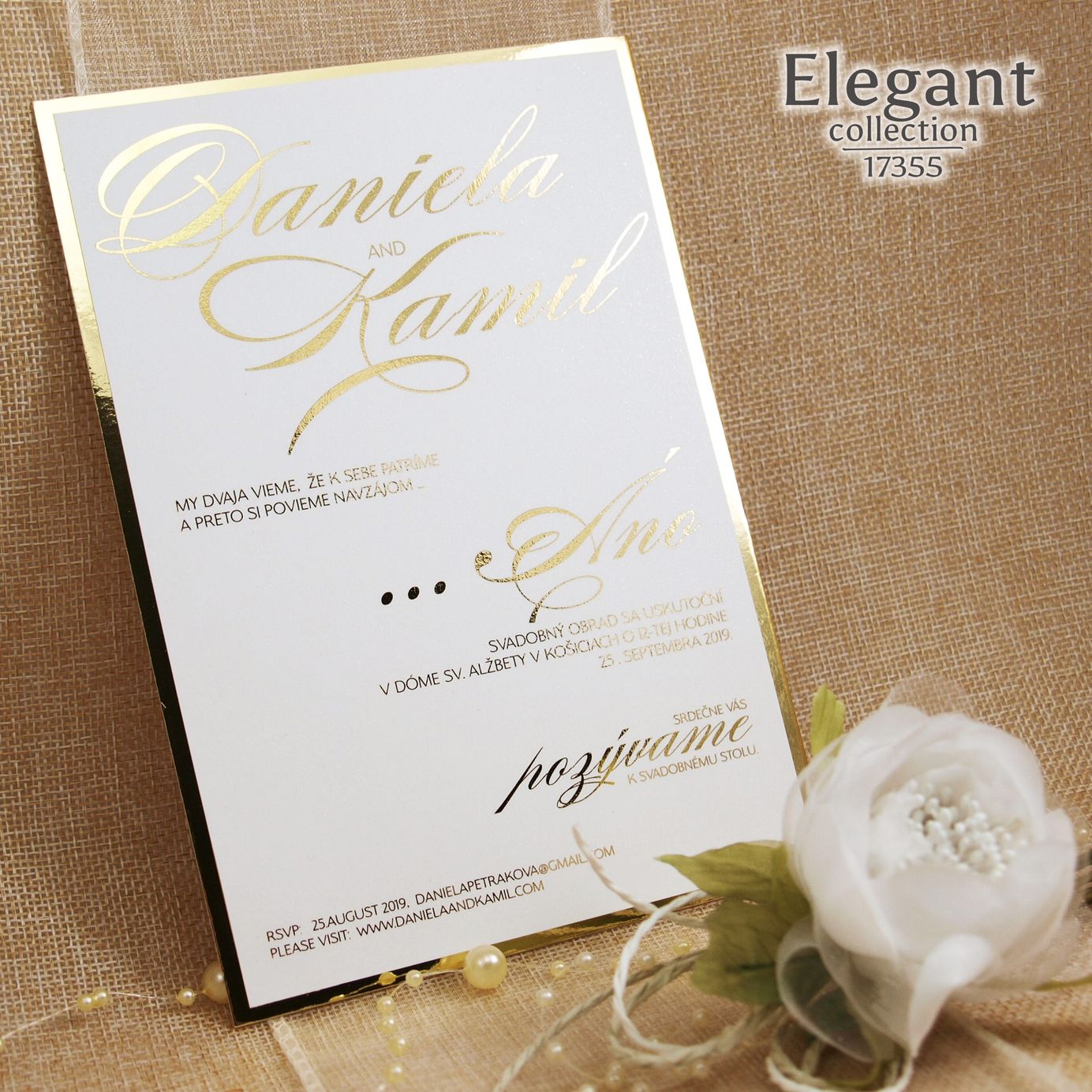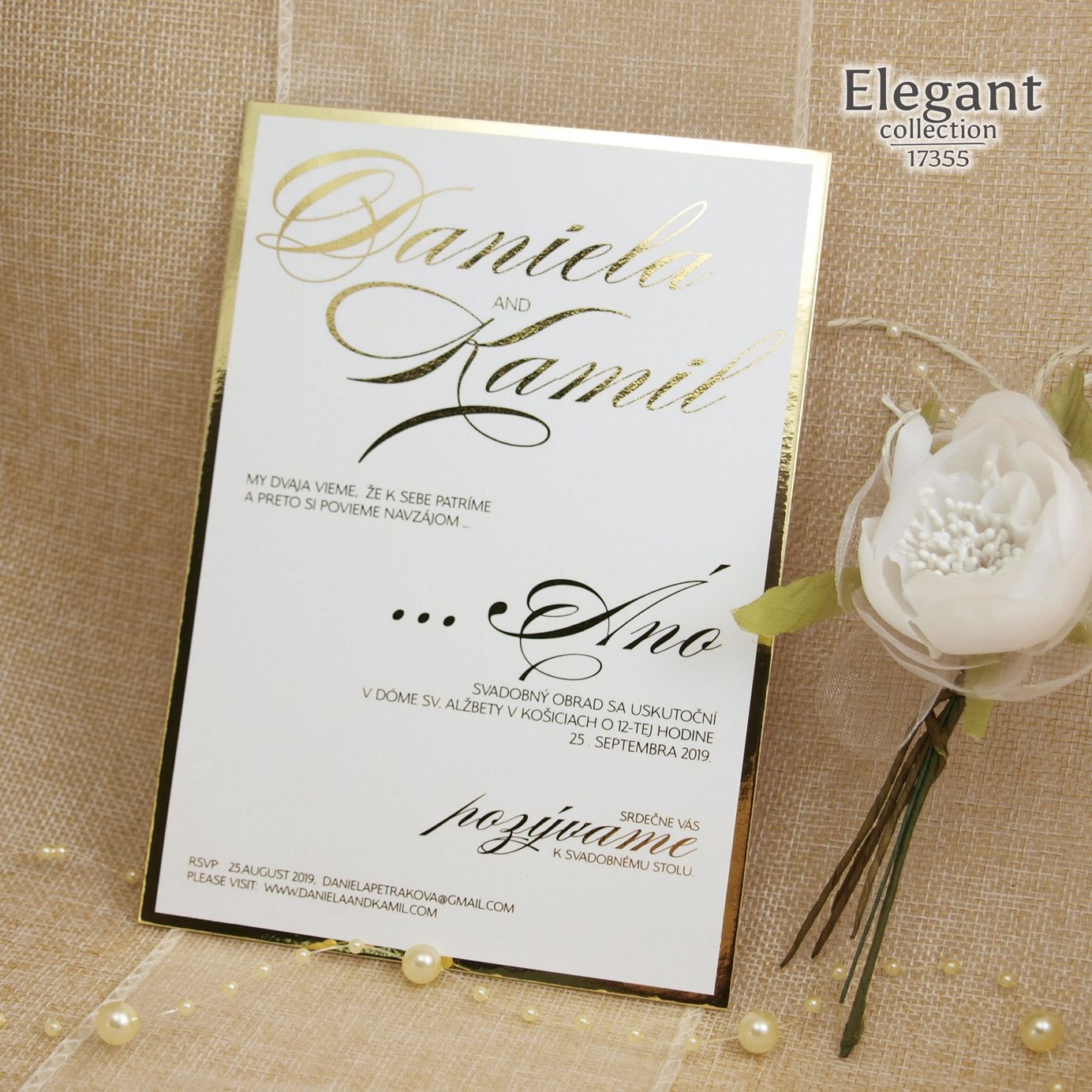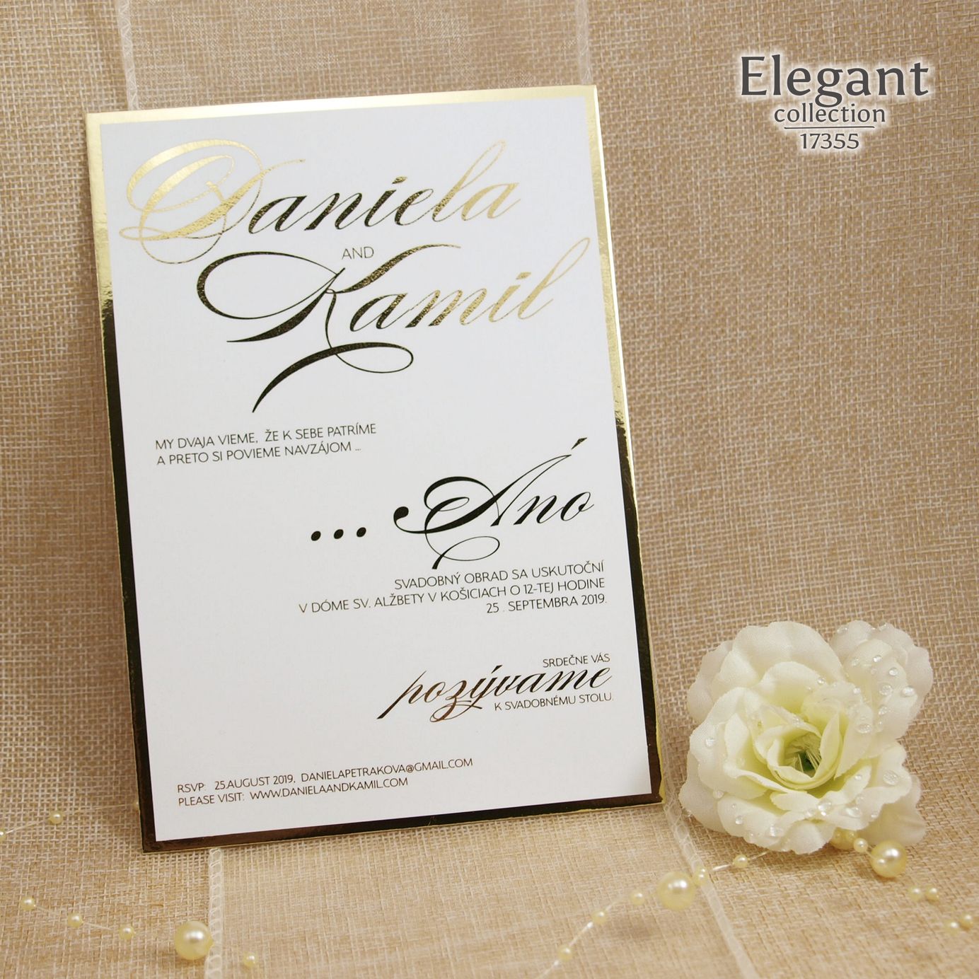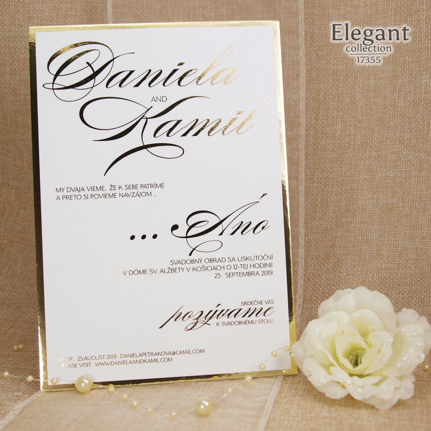 Moderné svadobné oznámenie tlačené zlatou fóliou na luxusnom bielom kreatívnom papieri s jemnou perleťou. Oznámenie sa skladá z dvoch zlepených kartičiek-spodný papier je zrkadlovo zlatý luxusný kartón. Rozmer oznámenia je 120x170mm. K oznámeniu sa v tomto štýle vyrábajú aj ostatné tlačoviny na svadbu.