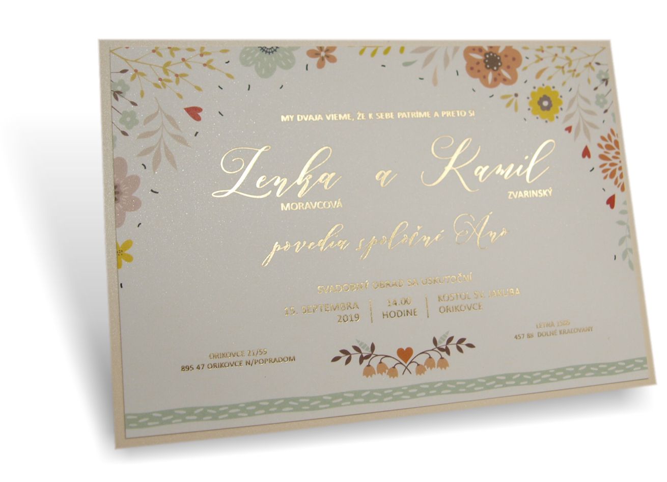 Moderné svadobné oznámenie. Plnofarebná kvetinová potlač na perleťovom bielom papieri. Tlač textov zlatou termoražbou . Luxusný nádych oznámeniu dodáva podlepenie krémovým metalickým papierom. K oznámeniu sa v tomto štýle vyrábajú aj ostatné tlačoviny na svadbu.