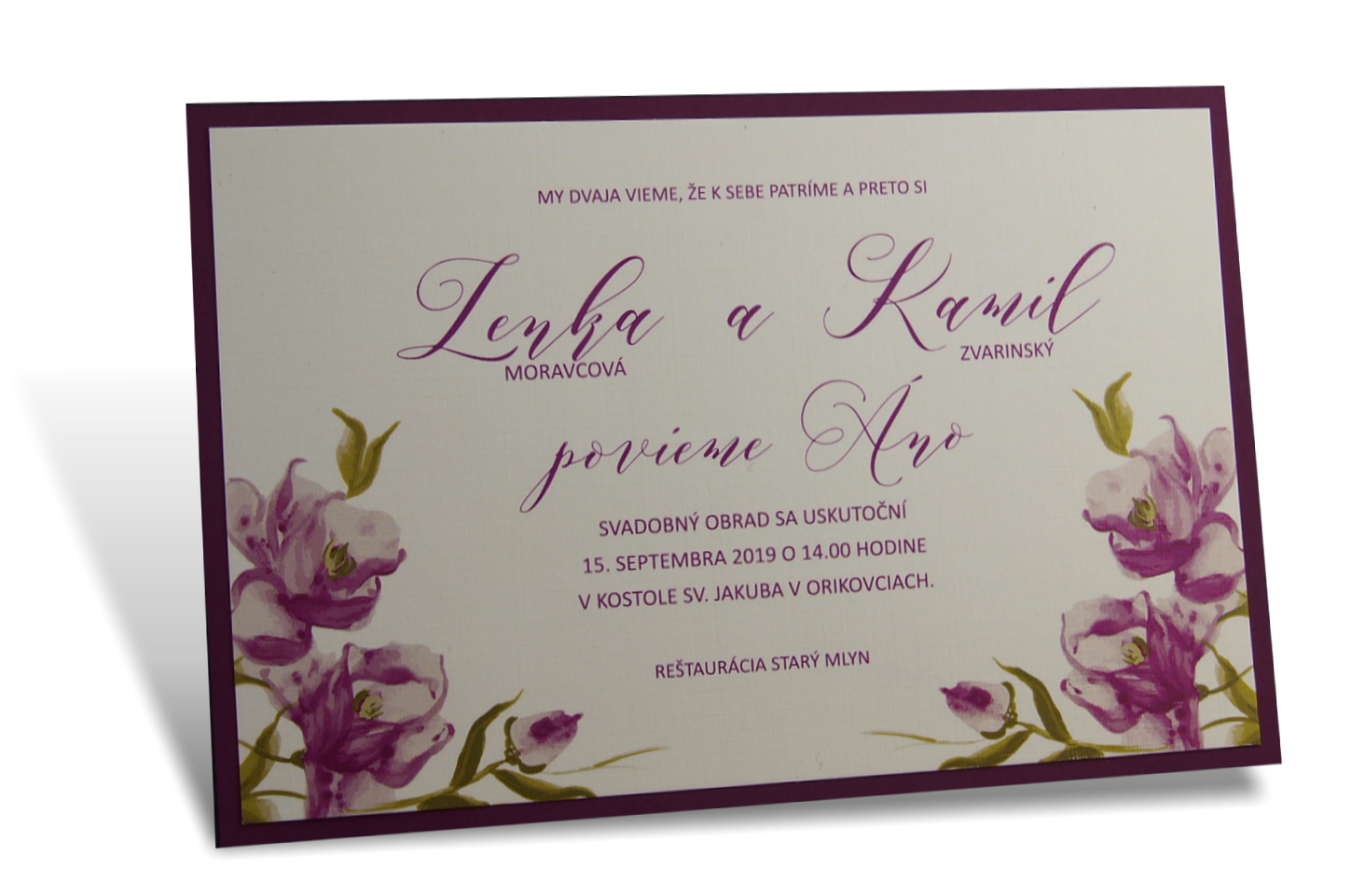 Moderné svadobné oznámenie. Plnofarebná kvetinová potlač na bielom štruktúrovanom papieri. Tlač textov digitálnou tlačou . Luxusný nádych oznámeniu dodáva podlepenie fialovým papierom. K oznámeniu sa v tomto štýle vyrábajú aj ostatné tlačoviny na svadbu.