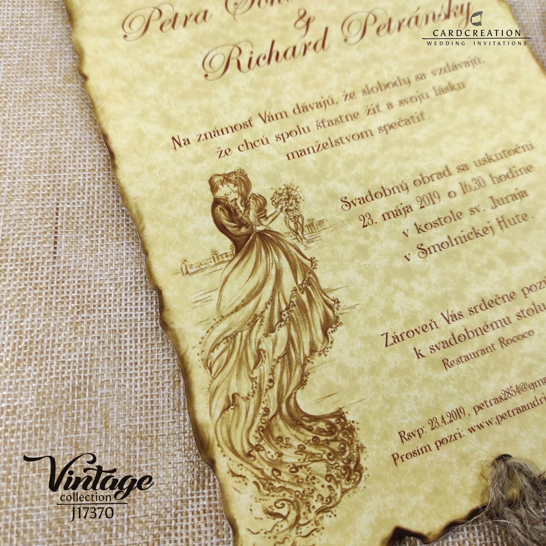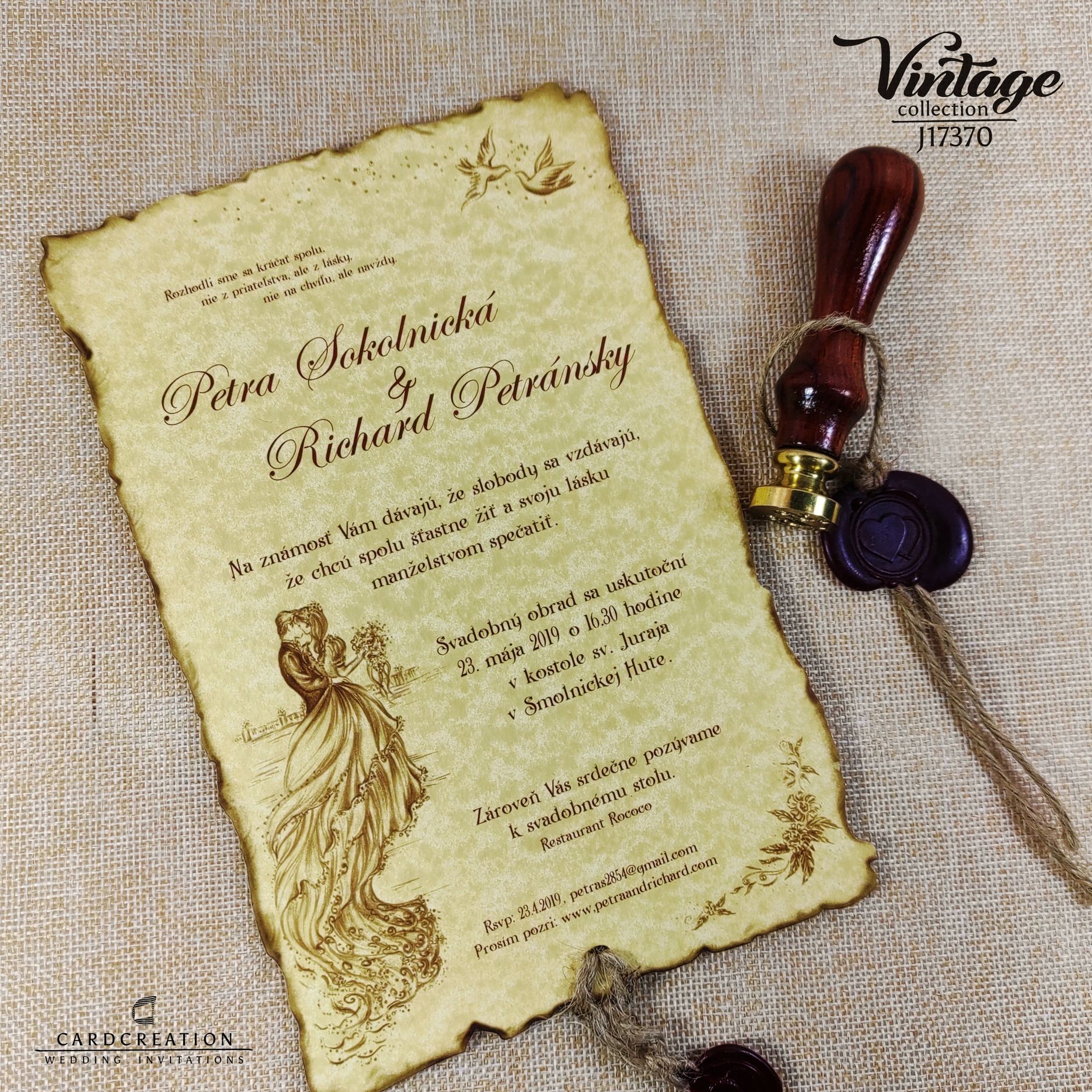 Oznámenie v tvare pergamenu obojstranne tlačené na prírodný bezdrevný papiera s tvarovým výsekom. Svadobné oznámenie s neutrálnou pečaťou ( srdiečka ).