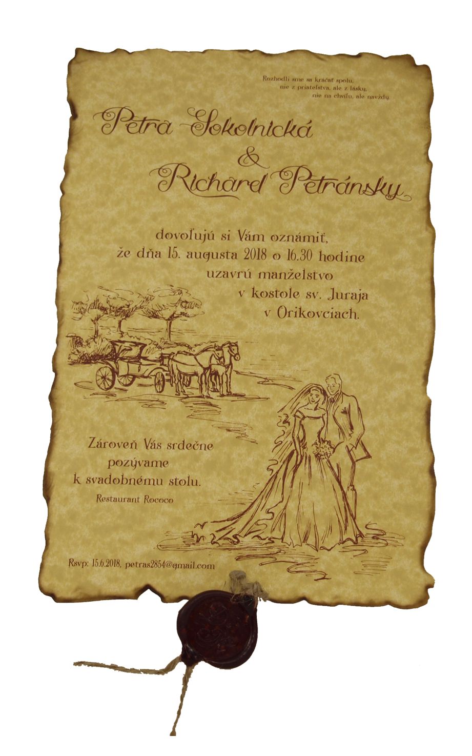 Oznámenie v tvare pergamenu obojstranne tlačené na prírodnom bezdrevnom papieri. Svadobné oznámenie s neutrálnou pečaťou ( srdiečka ).