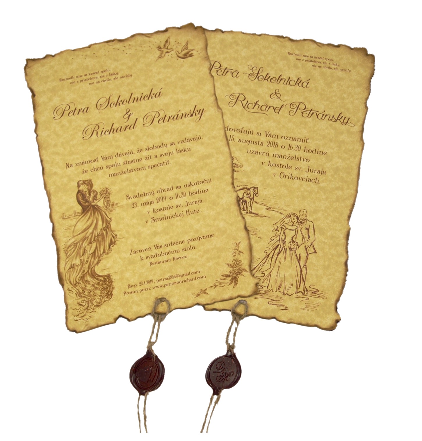 Oznámenie v tvare pergamenu obojstranne tlačené na prírodnom bezdrevnom papieri. Svadobné oznámenie s pečaťou s inicálmi mladomanželov.