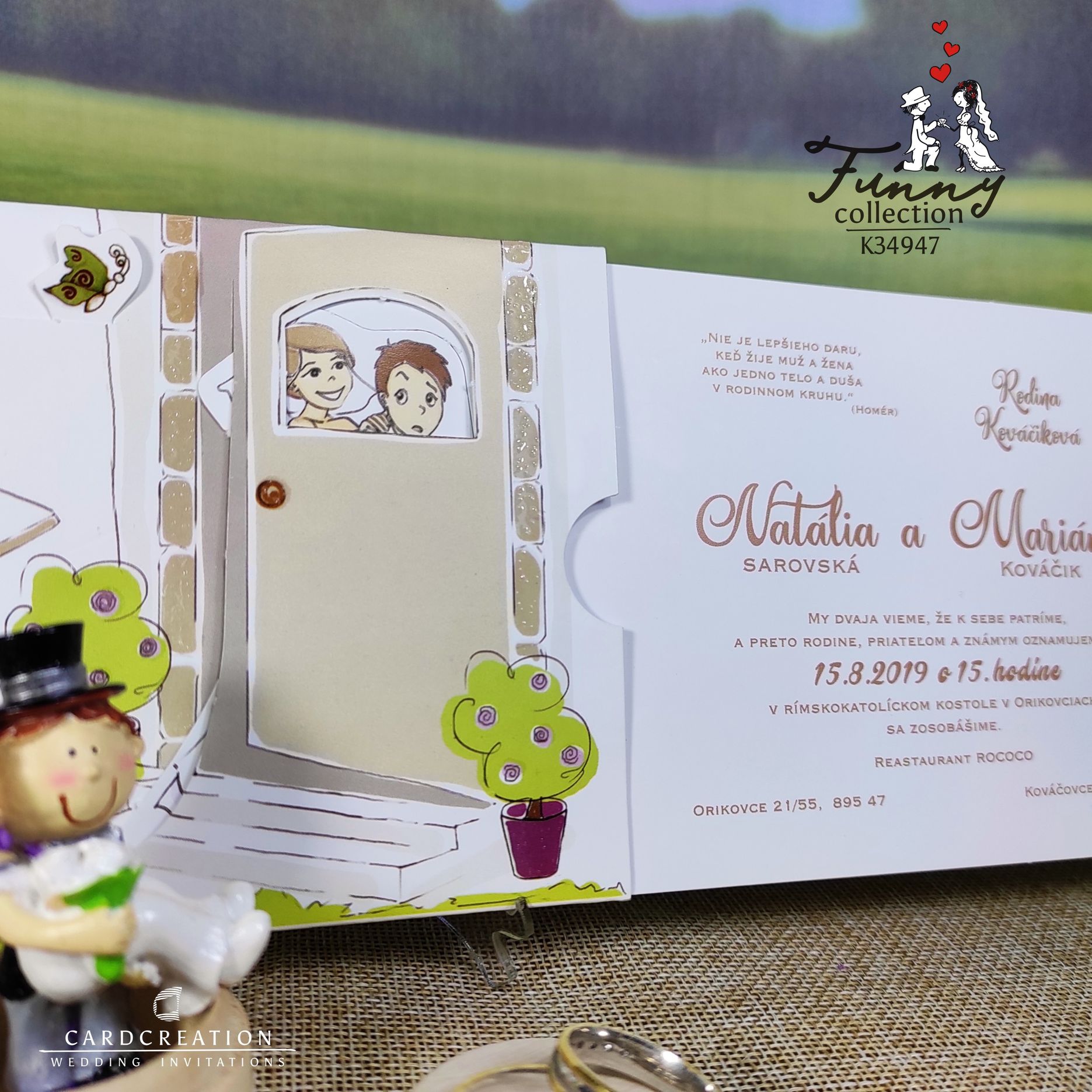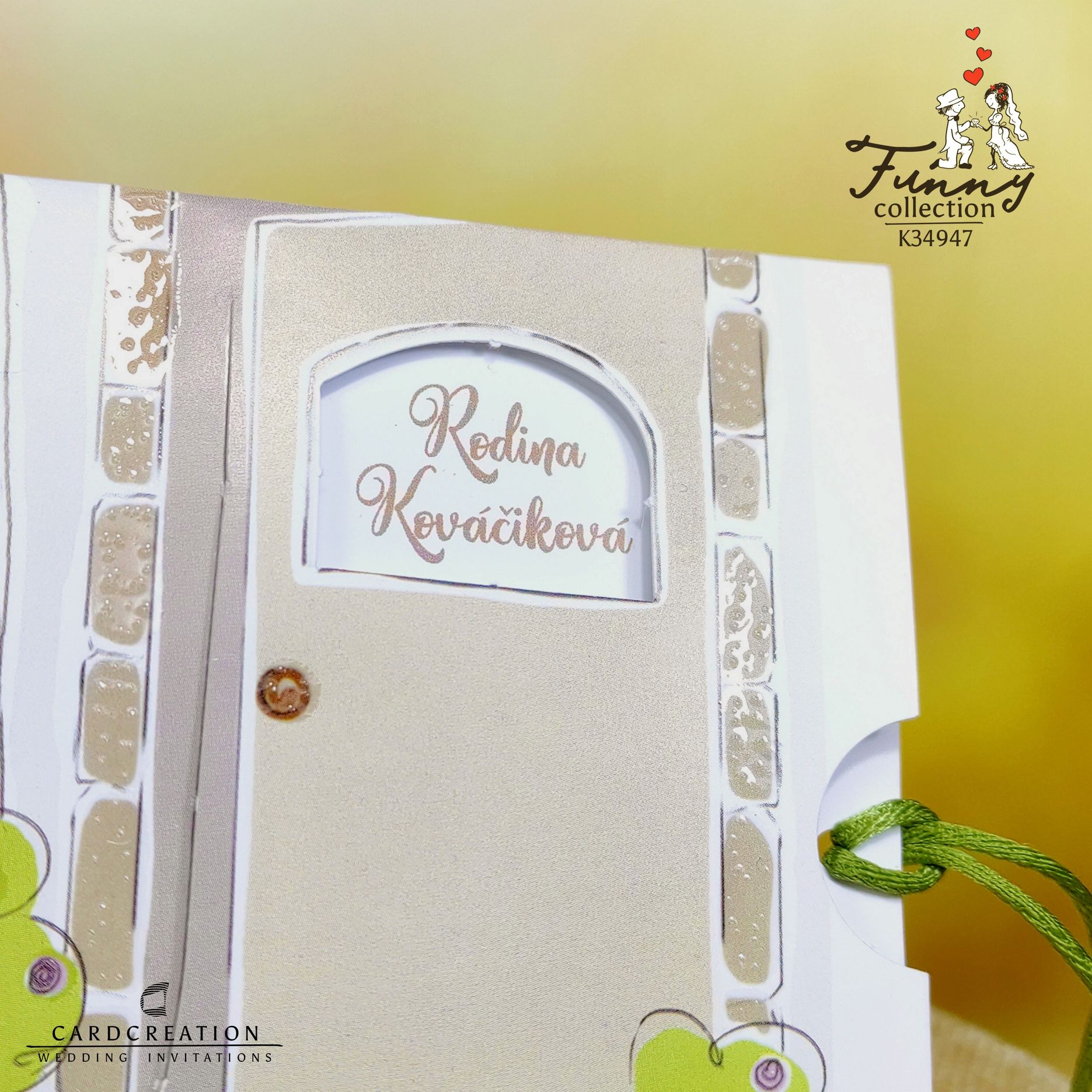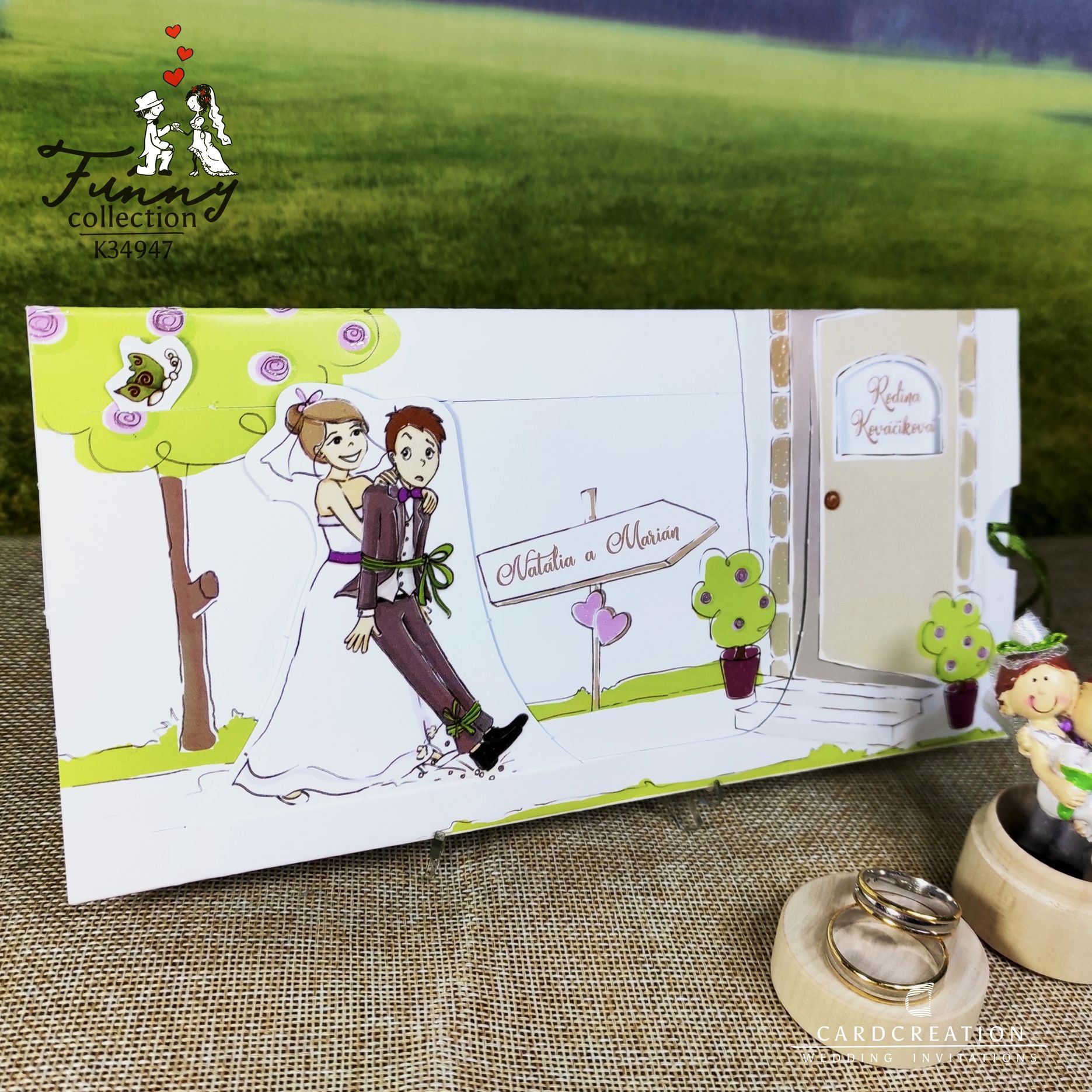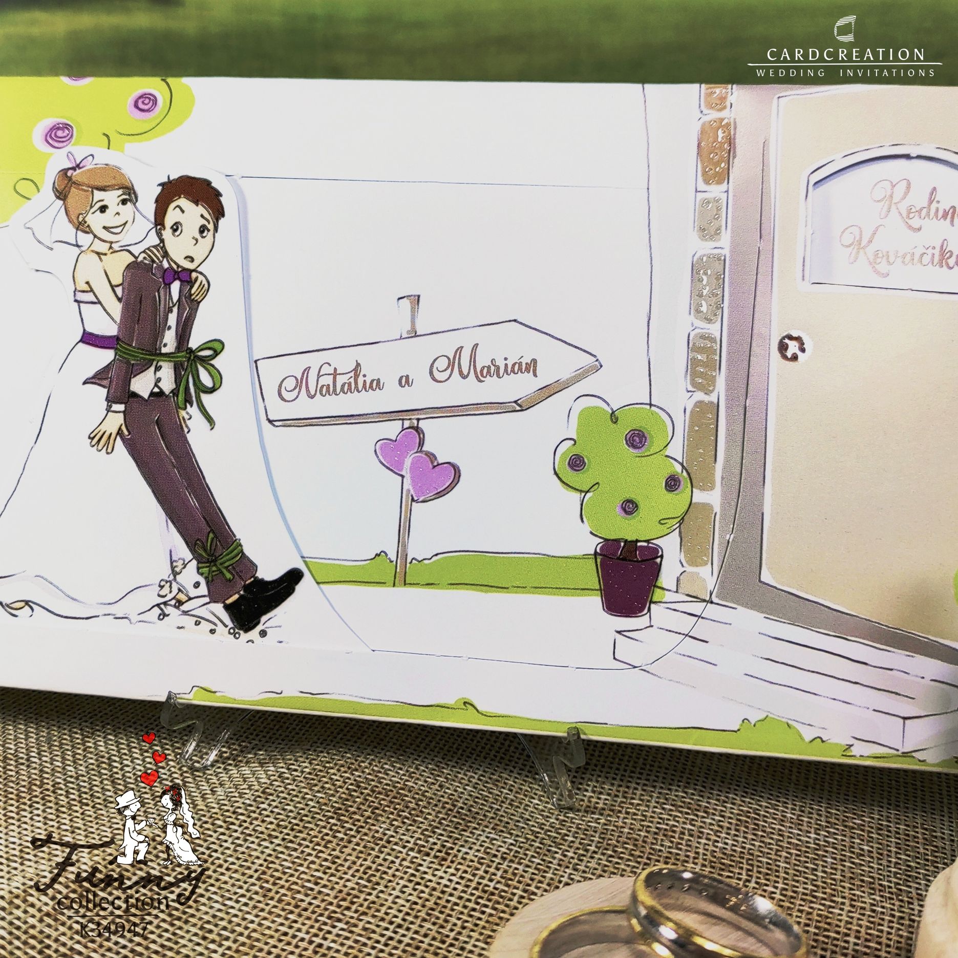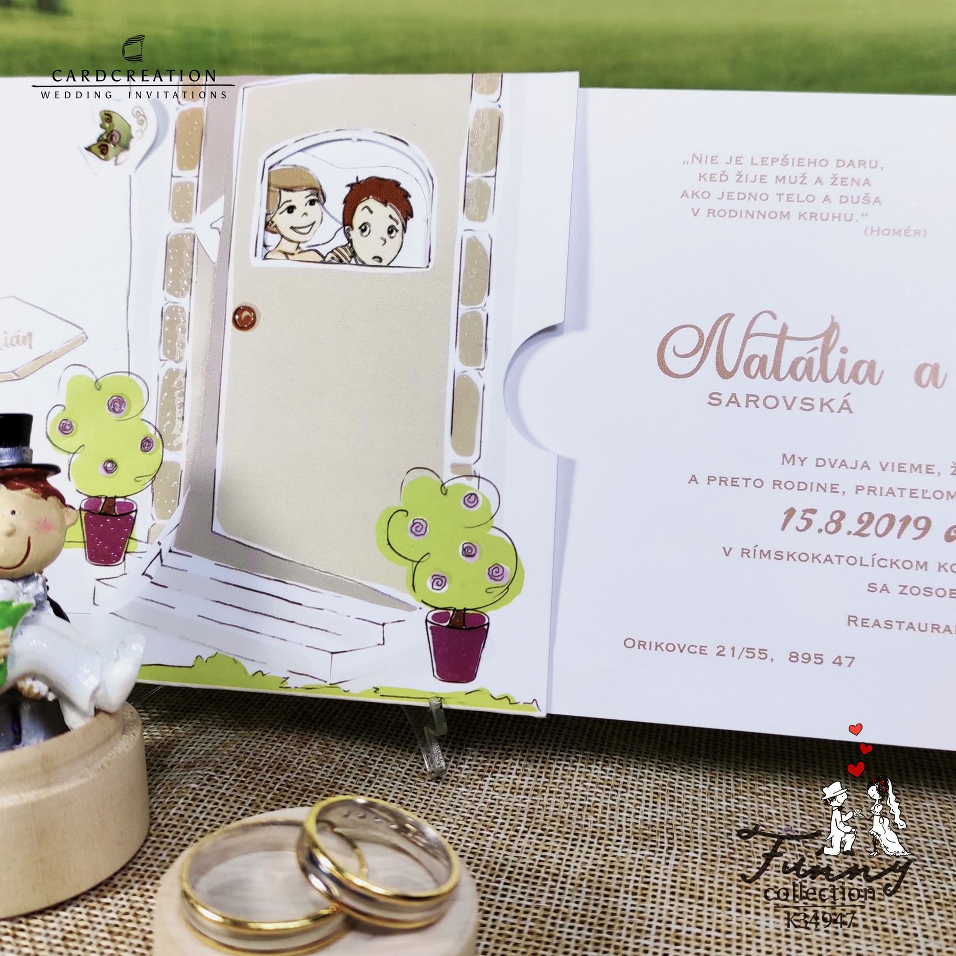 Humorné svadobné oznámenie s tvarovým výsekom. Vytiahnutím vnútornej karty nevesta dotiahne ženícha do domčeka. Oznámenie je natlačené hnedou digitálnou tlačou.