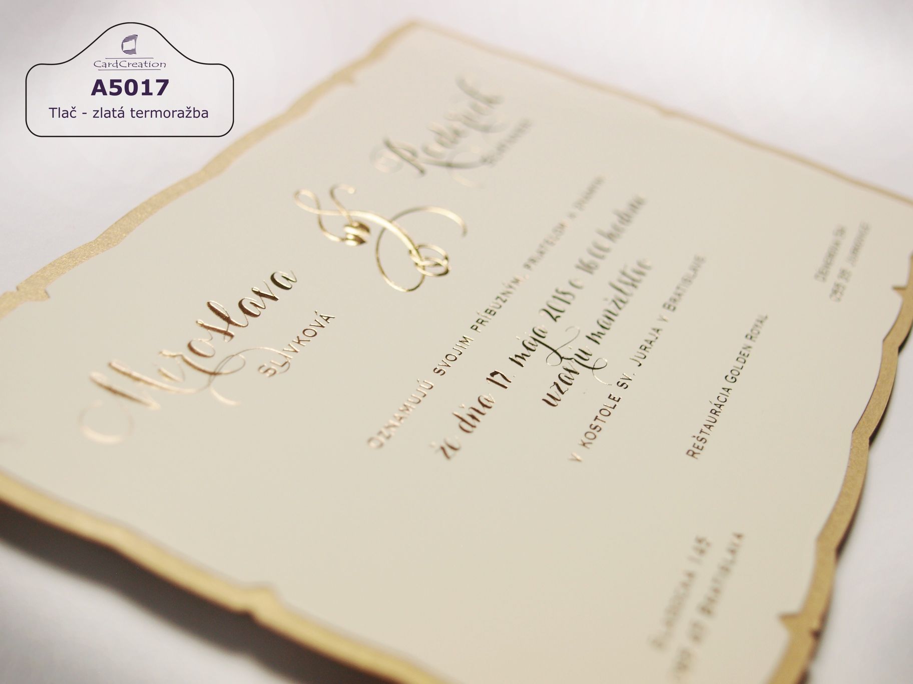 Svadobné oznámenie vyrobené z krémového papiera s 3D zlatou ražbou. Texty tlačené zlatou termoražbou. Oznámenie je podlepené zlatým metalickým papierom