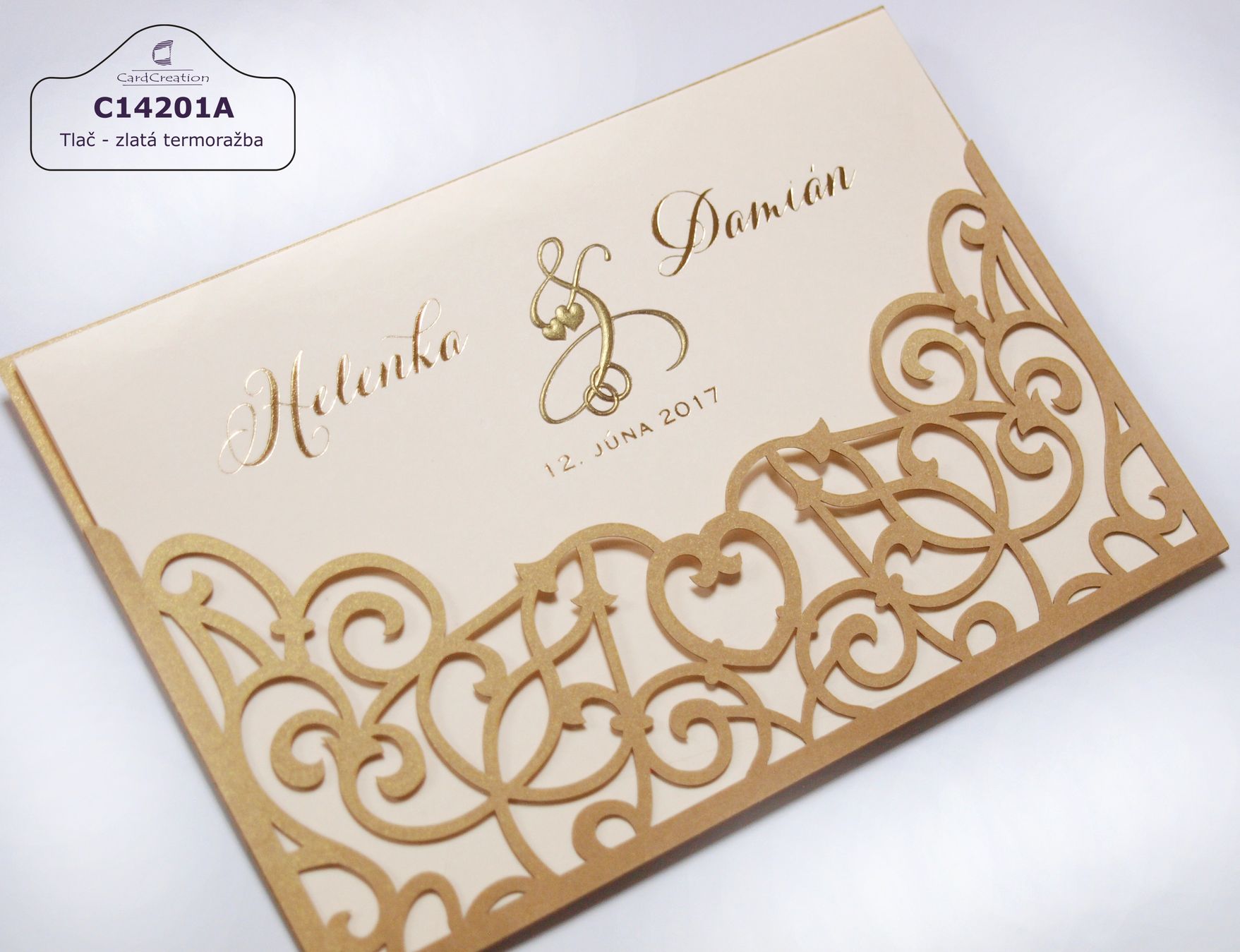Moderné svadobné oznámenie C14201A. Obal oznámenia je z tmavšieho zlatistého papiera vyrezávaný laserom. Vnútorná otváracia karta je vyrobená zo svetlého ivory papiera s 3D zlatou ražbou . Texty sú tlačené zlatou termoražbou.