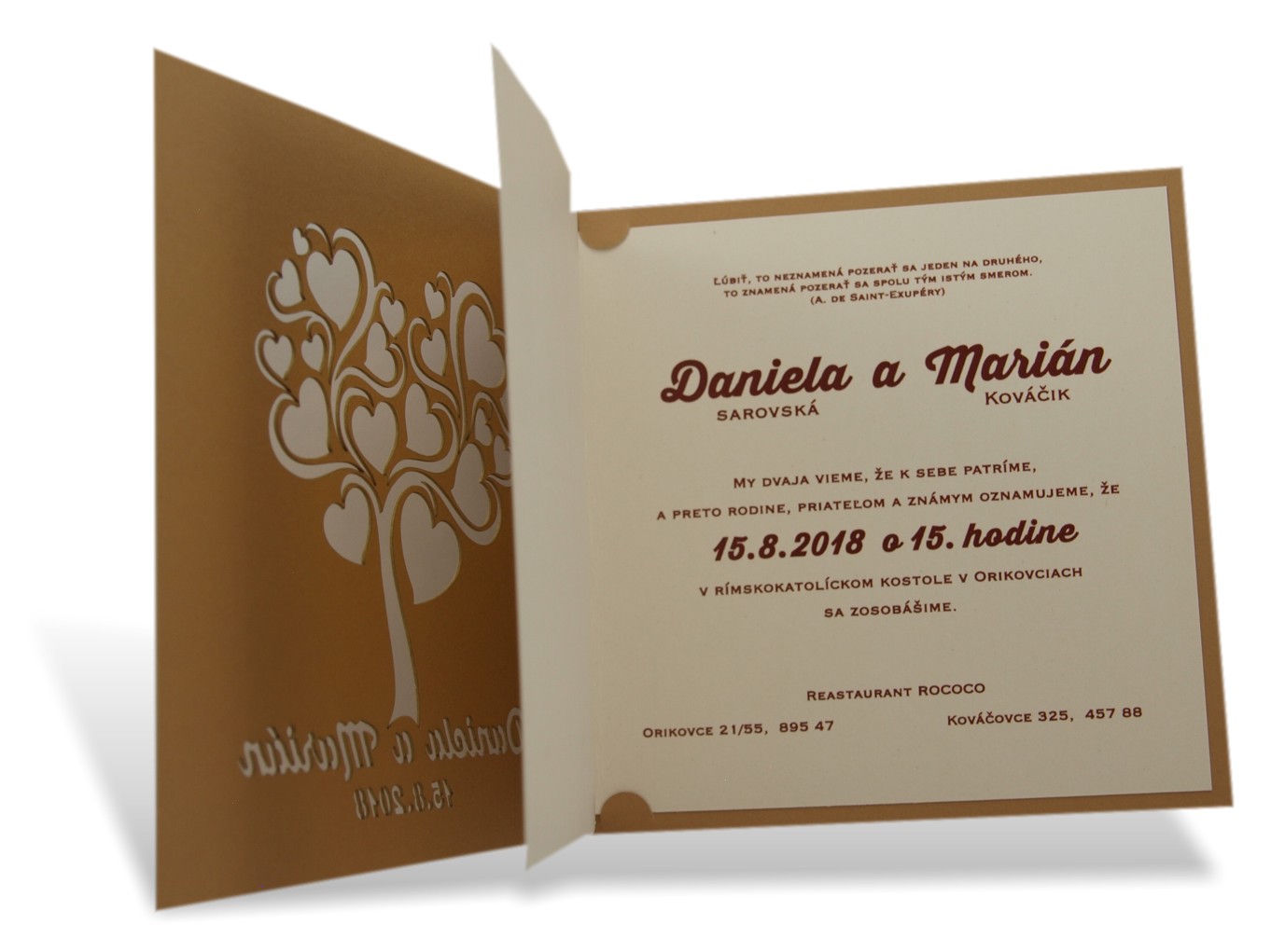 Obal oznámenie je vyrezávaný laserom z dreveného papiera. Je možná zmena papiera za inú farbu. Vnútro oznámenia je z jednej strany zlaté a z vnútornej strany biele a je tlačené digitálnou tlačou. K oznámeniu sa v tomto štýle vyrábajú aj ostatné tlačoviny na svadbu.