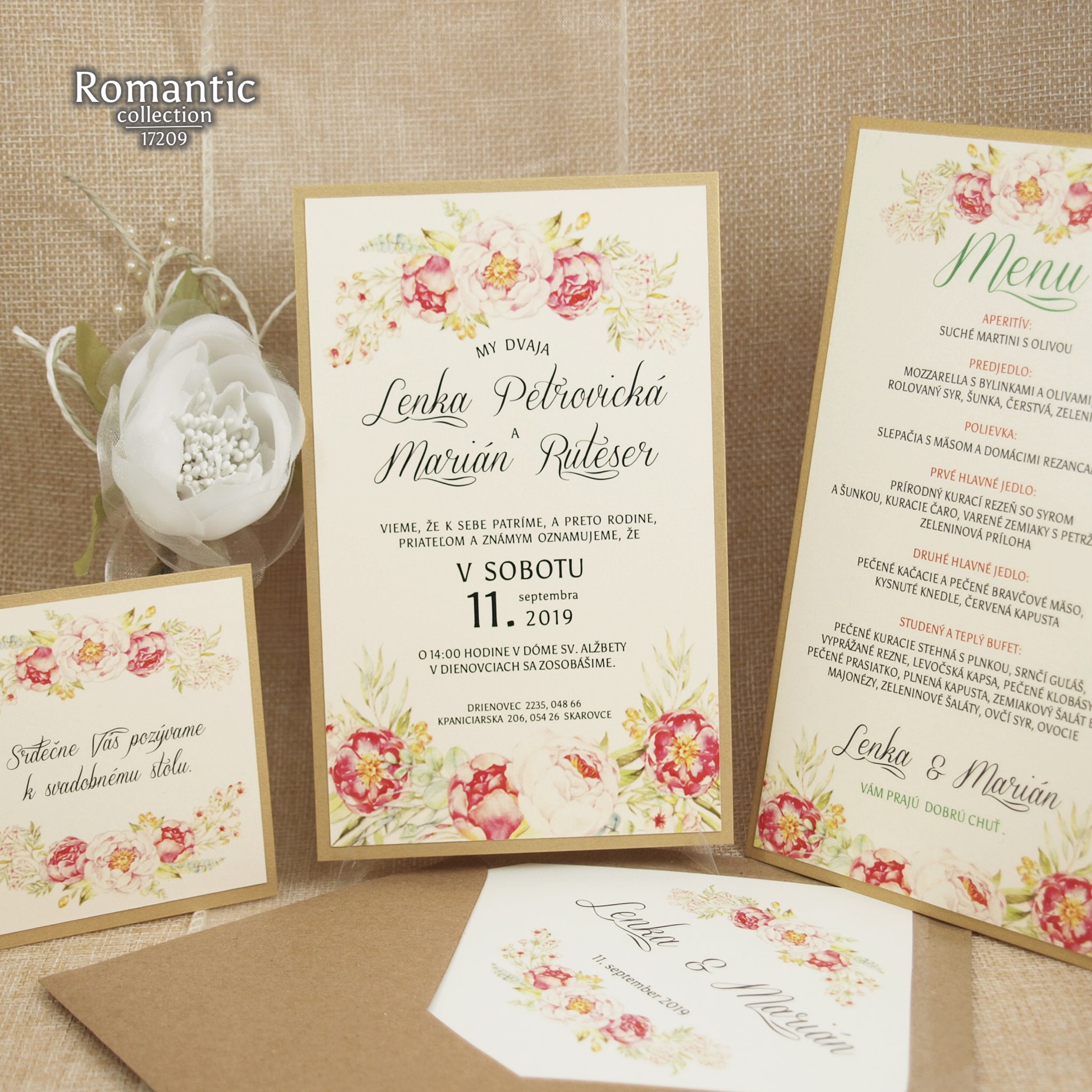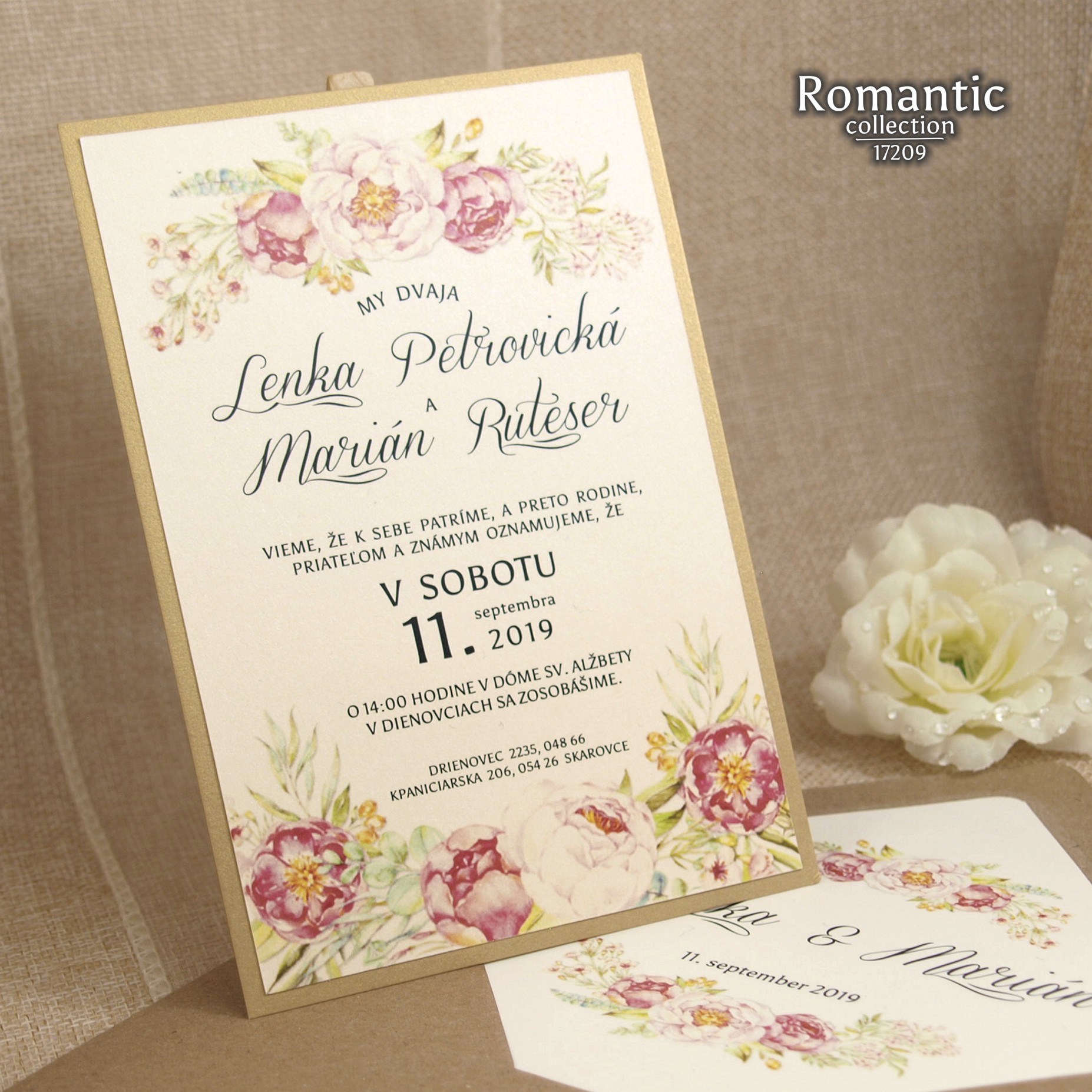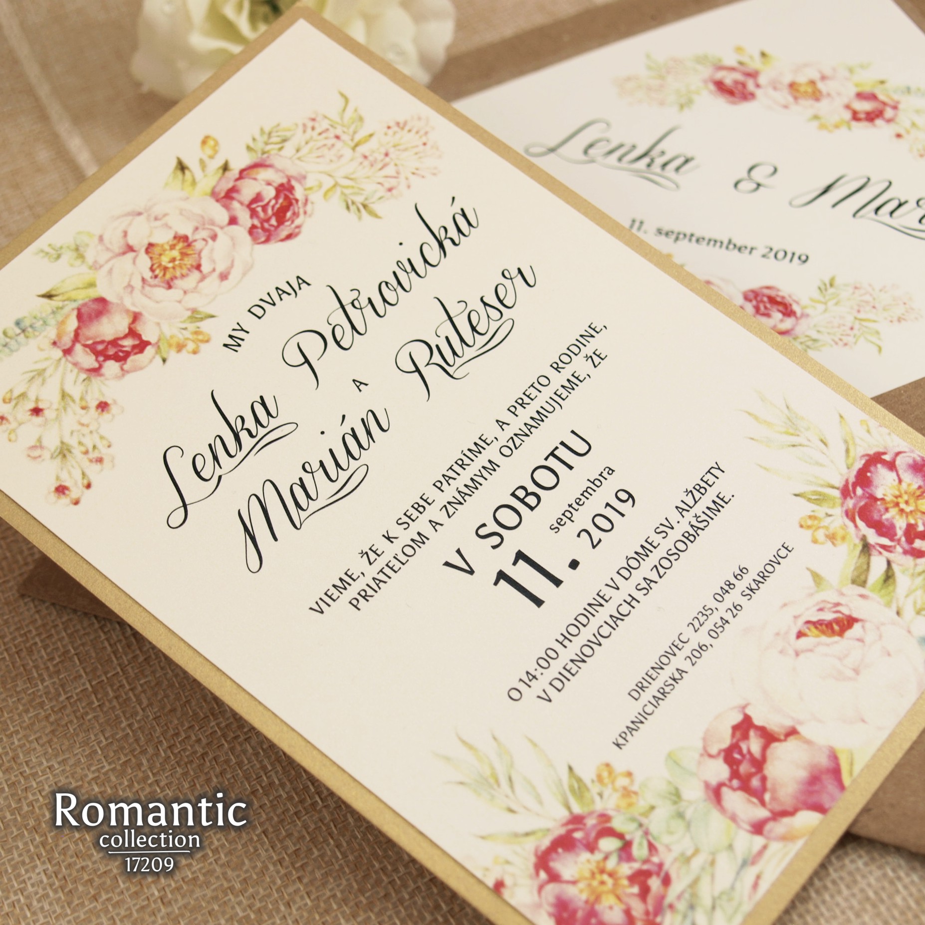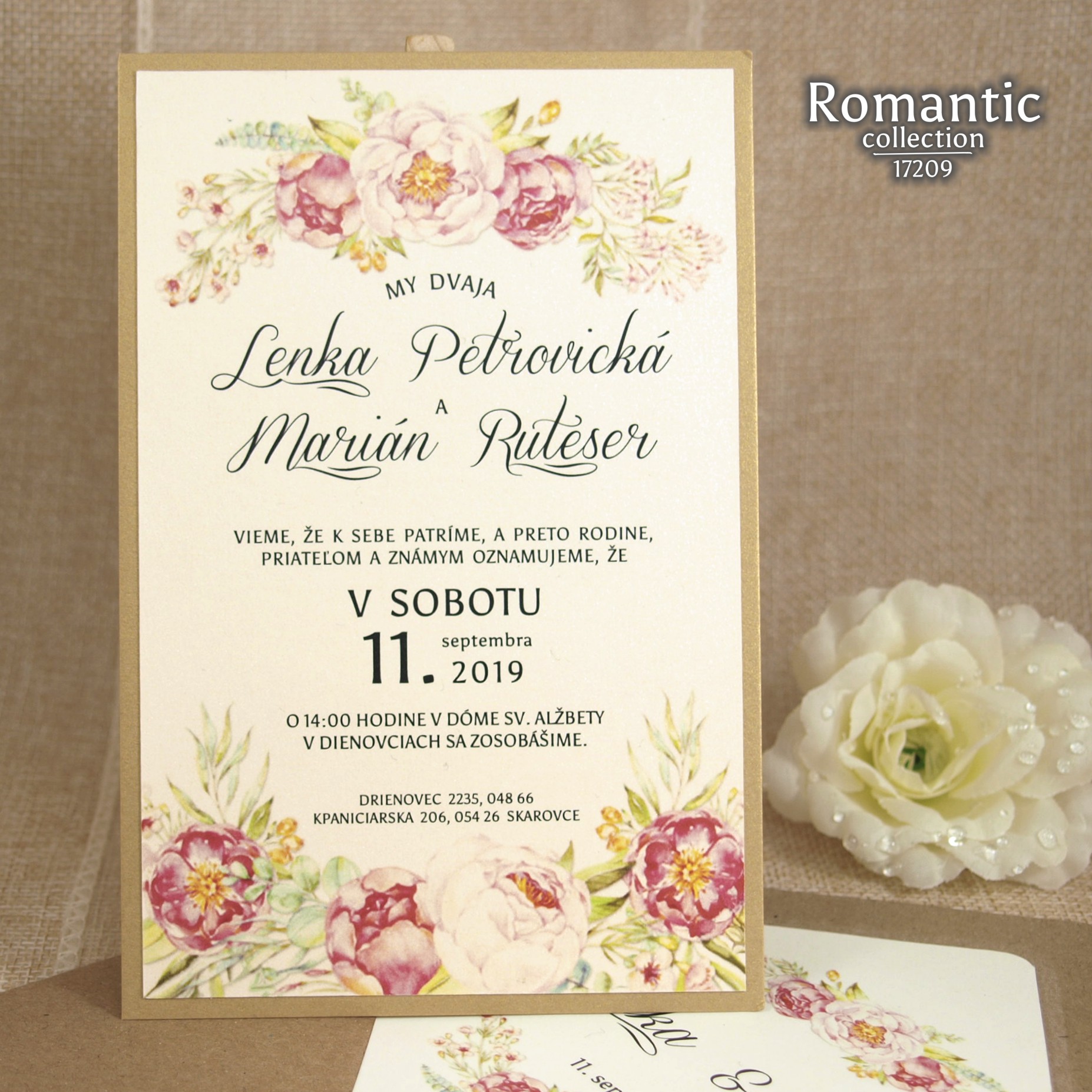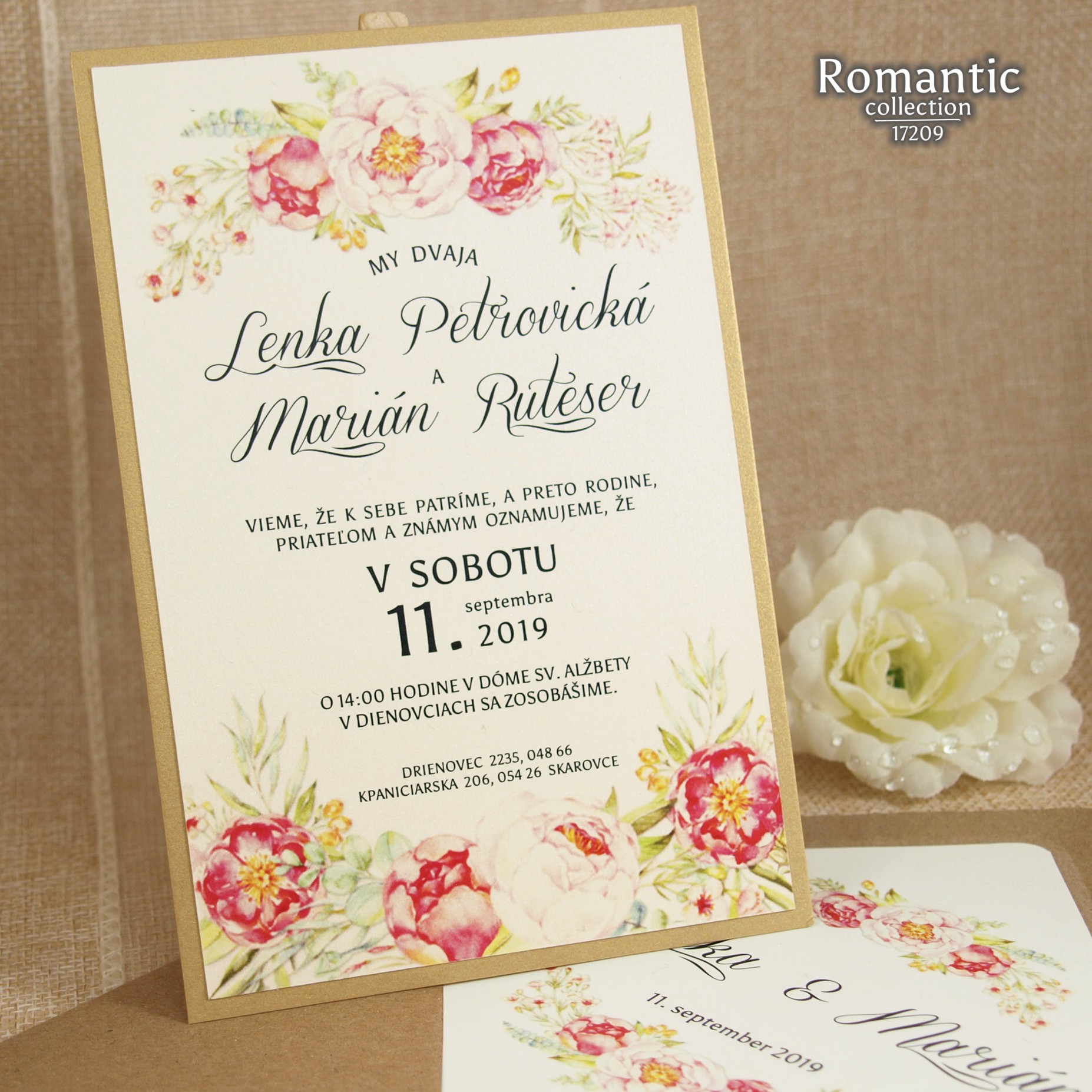 Jarné, svieže svadobné oznámenie natlačené na krémovom metalickom papieri. Oznámenie je podlepené tmavším zlatistým metalickým papierom. K oznámeniu sa v tomto štýle vyrábajú aj ostatné tlačoviny na svadbu.
