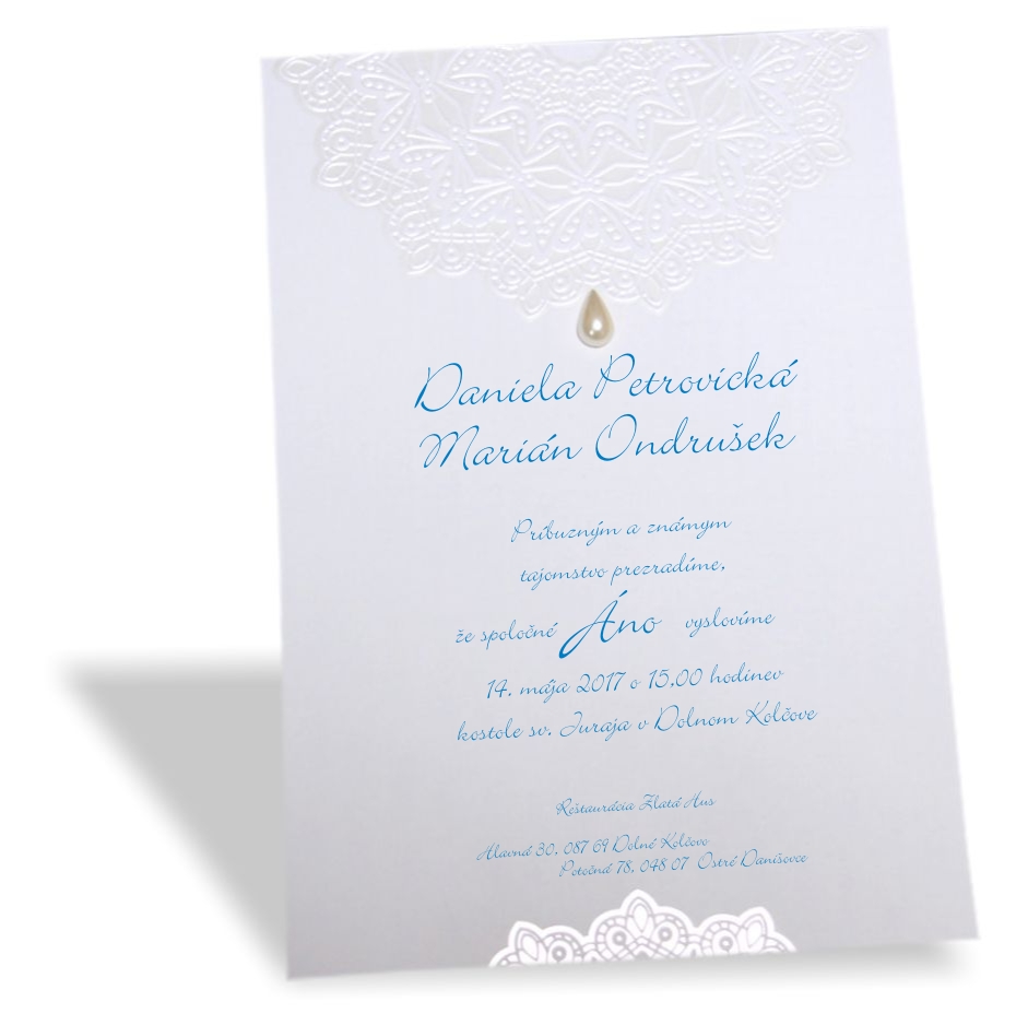 Svadobné oznámenie z bieleho matného papiera s perleťovou 3D ražbou a perlovou slzičkou. Rozmer karty: 140×200 mm