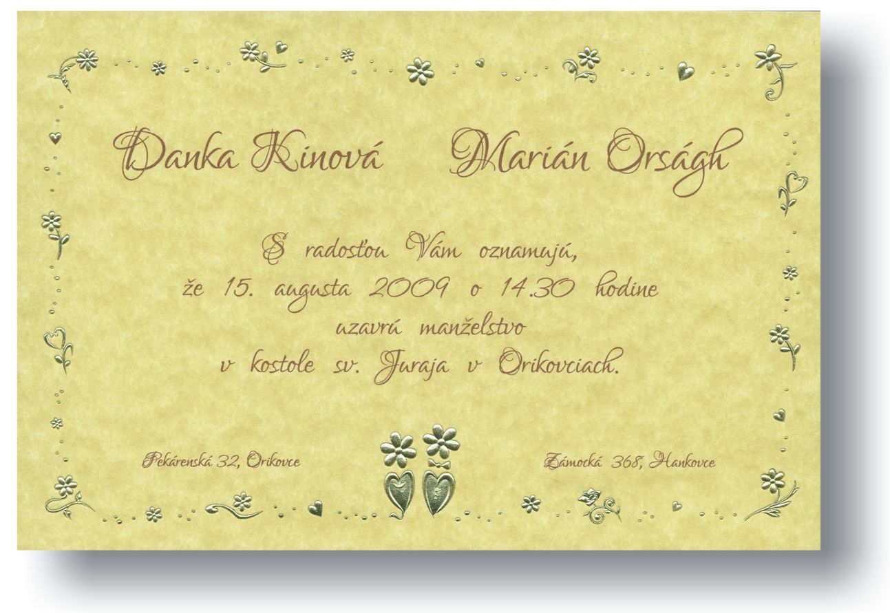 Svadobné oznámenia z prírodného bezdrevného nenatieraného kartónu s textúrou pergamenu so zlatou 3D ražbou. Rozmer svadobného oznámenia: 150×100 mm
