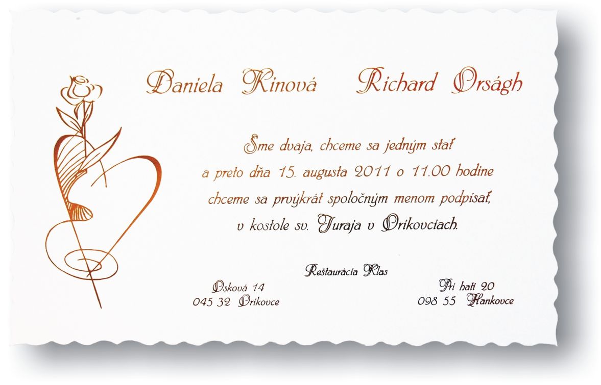 Svadobné oznámenia z bieleho natieraného lesklého papiera s tvarovým výsekom. Text je natlačený zlatou termoražbou. Rozmer svadobného oznámenia:135×80 mm