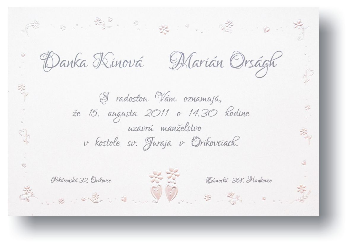 Svadobné oznámenia z bieleho natieraného lesklého papiera s perleťovou 3D ražbou. Rozmer svadobného oznámenia: 150×100 mm