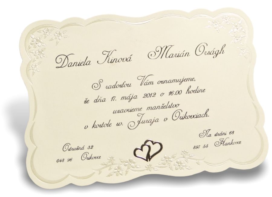 Svadobné oznámenia z krémového natieraného lesklého papiera s tvarovým výsekom a perleťovou a zlatou 3D ražbou. Text je natlačený zlatou termoražbou. Rozmer svadobného oznámenia: 150×100 mm