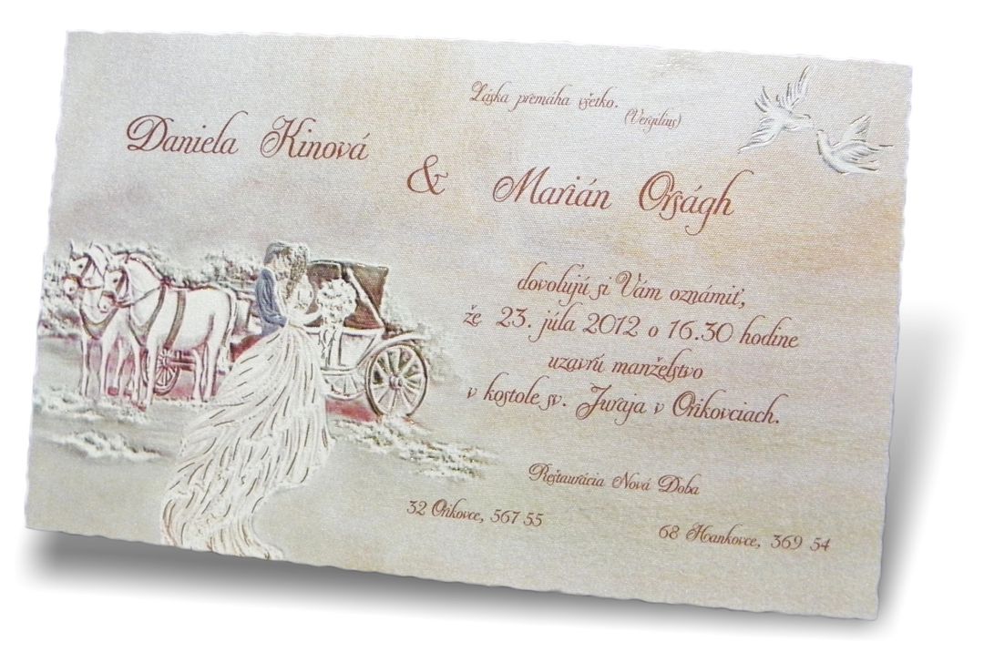 Svadobné oznámenia s ozdobným výsekom zo strieborného metalického papiera s farebnou potlačou a so zlatou termoražbou. Rozmer svadobného oznámenia: 170 x 100 mm