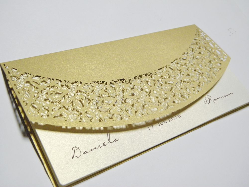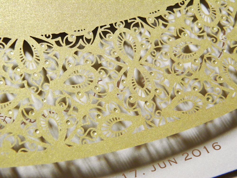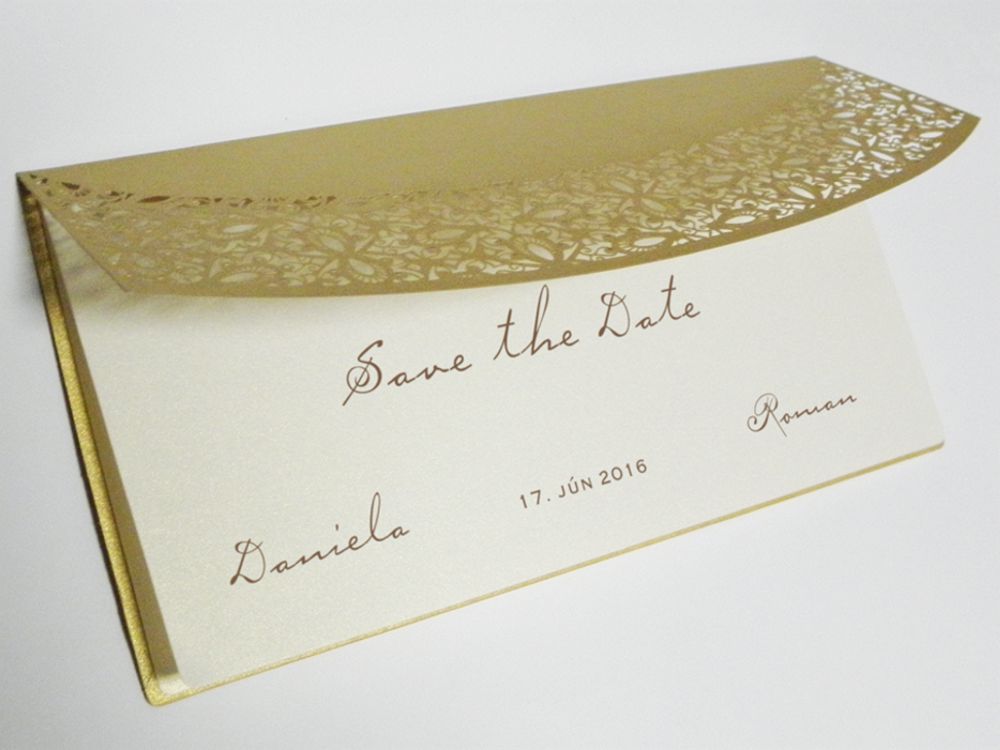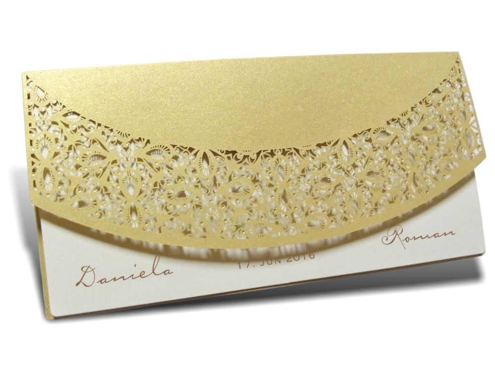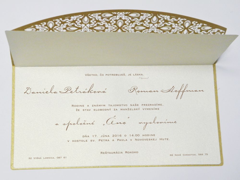 Otváracie luxusné svadobné oznámenia. Obal oznámenia je vyrobený zo zlatého metalického papiera s laserom vyrezávaným ornamentom. Ornament je dozdobený pozlátenými predmetmi. Vnútorná kartička je z papiera s textúrou svetlostrieborného metalického efektu. Text sa tlačí efektnou termogravúrou. Rozmer zloženej karty: 200×100 mm